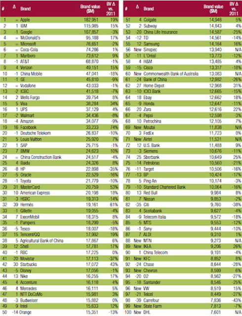 Aquí está el ranking de las 100 marcas más valoradas del mundo y su evolución respecto al año anterior: