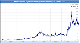 A partir de ese momento, la prima de riesgo francesa fue descendiendo hasta los 143 puntos en Mayo de 2012 hasta que lentamente está volviendo a sus niveles normales por debajo de los 100 puntos.