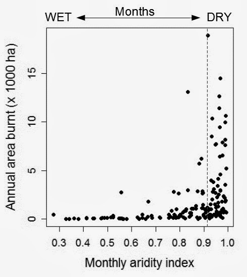 | Relación entre la aridez y el área quemada (Pausas y Paula, 2012) |