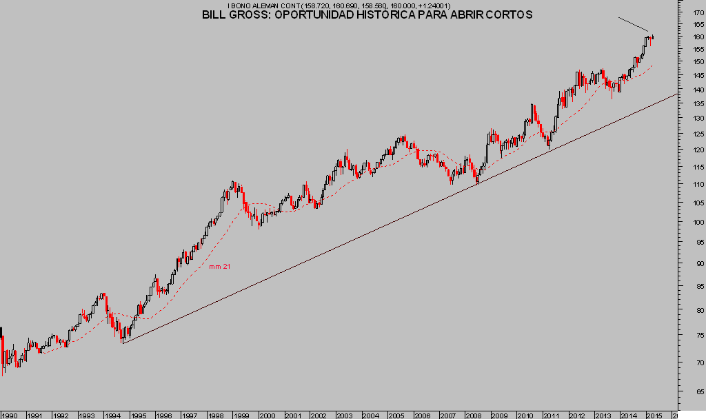 Bill Gross considera la situación aberrante y los riesgos altos, ha publicado un Twit que resume su opinión en una simple frase, recomendación, “German 10yr Bunds = The short of a lifetime. Better than the pound in 1993. Only question is Timing / ECB QE”.