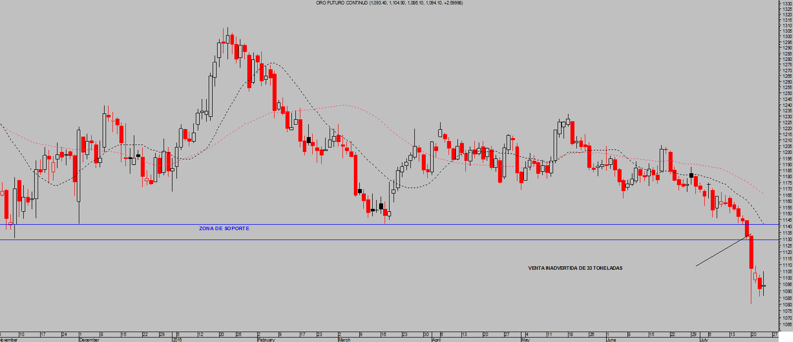 El mercado no pudo absorber tal avalancha de ventas y el impacto en precio fue directo y contundente, tal como presuntamente buscaban las manos negras. La zona de soporte establecida en el entorno $1130-$1140 fue perforada como si se tratase de mantequilla y el precio cayó a plomo hasta $1.080 por onza.