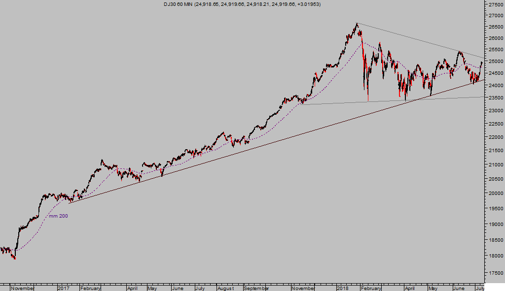 Atención al área de los 24.500 puntos del Dow Jones, su perforación en cierres será un motivo de nerviosismo para los operadores de más corto plazo, atraerá ventas y caída presumiblemente pronunciada de las cotizaciones.
