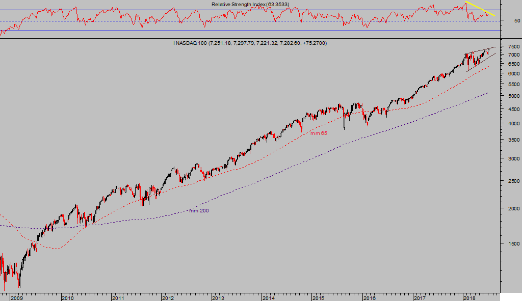 El índice tecnológico, Nasdaq, presenta una tendencia alcista excesivamente prolongada y con síntomas de cansancio, pérdida de momentum y divergencias de medio plazo. La estructura de la pauta es delicada y puede ser quebrada ante cualquier proceso de ventas de corto plazo. En tal caso, incidirá en la psique de los inversores con orientaciones al medio y largo plazo.